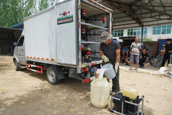 测算了准确的面积后,团队将农户自行购买的农药按照比例进行配比,调出适合的浓度。
