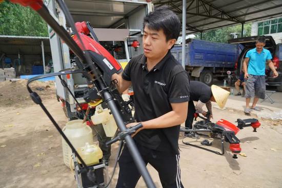 杨冲向记者介绍,河北目前有9000多万亩耕地,用无人机植保作业的不及5%。“现在我们团队的四架飞机累死累活一年也打不了多少亩地,涿州再添10架无人机也不够,市场还很大。”杨冲感慨。