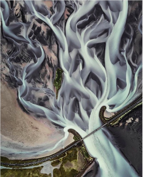 (无人机航拍作品。冰川融水通过河口流入海洋。想知道这河的规模有多大?你对照小汽车通过河口上的大桥就知道了。)