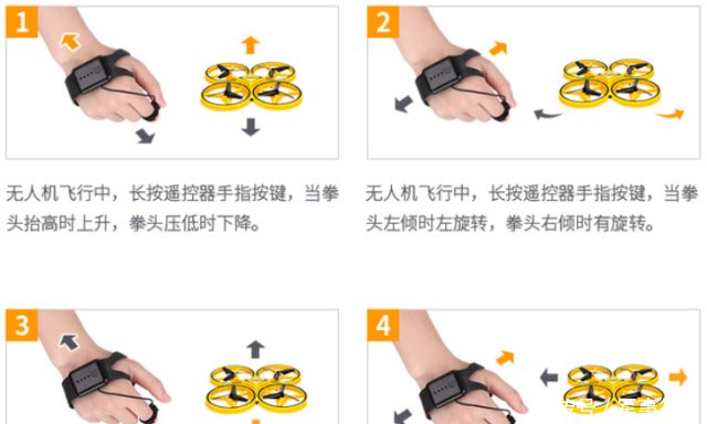 手表式遥控器主要分为两个部分,一个为主体按键,另一个为手指按键。前者控制开机和降落,后者控制飞行速度及转向等。