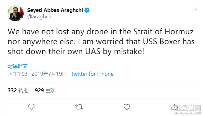 伊朗副外长阿拉格齐也在其社交网媒体上表示,美国人可能打下来了自己家的无人机