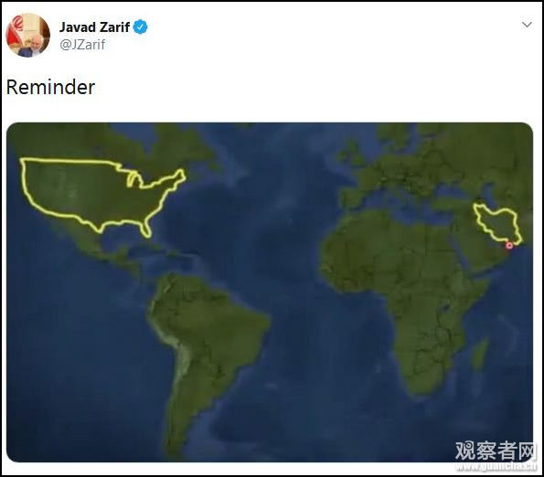 在获悉特朗普宣布击落伊朗无人机以后,伊朗外长扎里夫又在推特上发了一张意味深长的照片,配文只有一个单词“提醒”(reminder)。