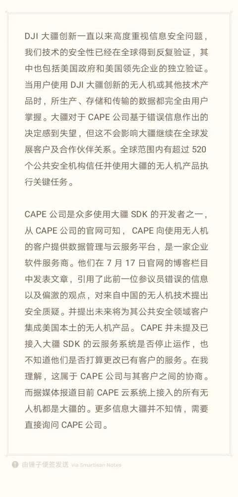 针对CAPE中断与大疆合作一事,近日大疆发表声明回应称,“对于CAPE公司基于错误信息做出的决定而感到失望。但这不会影响大疆继续在全球发展客户及合作伙伴关系。