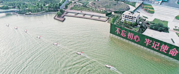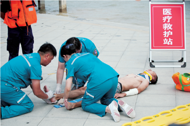 郑州市高新技术开发区天健湖公园的演练现场,冲锋舟编队驶向救援区域皮划艇编队消防战士进行科目演练医务人员进行急救演练