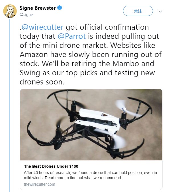 大疆(DJI)无人机近年来可以说是风生水起,堪称是目前无人机市场的领导者。过去虽然也有其他竞争对手,不过后期也都逐渐退出市场,无人机品牌Parrot便是其中之一。据外媒消息称这家来自法国的无人机公司近日宣布退出迷你无人机市场,集中开发商用无人机产品。
