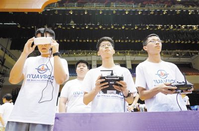 图为参赛选手在比赛中控制无人机飞行。