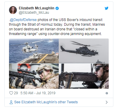 据Military.com报道,上周四,在波斯湾的一艘美国海军舰艇据称使用了一种新的反无人机系统来击落一架一千码内的伊朗无人机。在一份声明中,美国国防部证实,当一架“在一个威胁范围内”的固定翼无人机靠近正穿过霍尔木兹海峡的“拳师号”两栖攻击舰(USS Boxer )时,促使该船的船员采取“防御行动”。