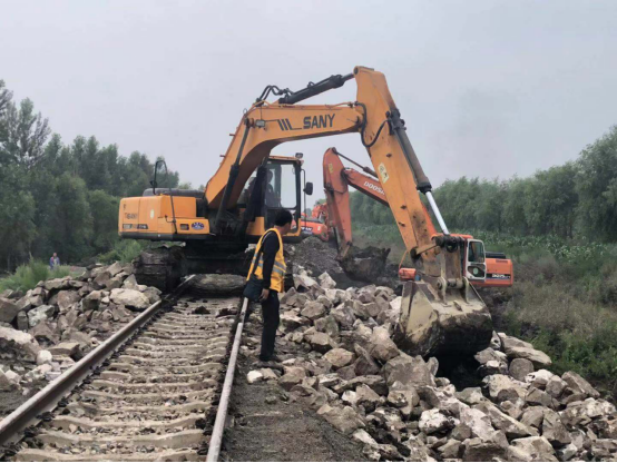 水害发生后,中国铁路哈尔滨局集团有限公司立即启动防洪应急预案,迅速封锁水害线路,及时调整列车运行方案,连夜组织抢修人员,紧急调集12台挖掘机、装载机、轨道车等大型抢险车辆,全力做好水害线路抢险复救工作。齐齐哈尔工务段、哈尔滨工务机械段等五个单位紧急组织500余名抢险人员赶赴水害现场抗洪抢险,陆续抢卸块石、碎石、土石毛等路料1.3万余吨,争分夺秒抢修线路。