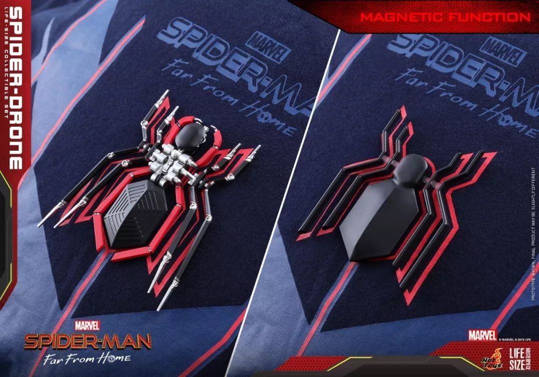 而且由于蜘蛛无人机和蜘蛛logo底部也有磁铁,所以它们俩是可以吸附在T恤上面的。这个设计非常有趣,可玩性确实增加了。
