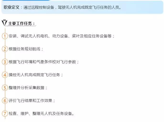 职业定义:通过远程控制设备,驾驶无人机完成既定飞行任务的人员