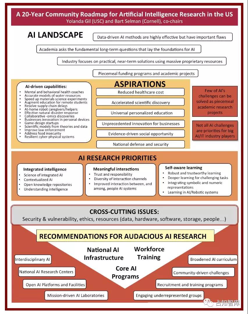 2019年5月14日,美国计算联盟和人工智能促进协会发布《美国人工智能未来20年研究路线图》(草案),共117页,预计7月份发布正式版,通过本路线图,可以全面了解人工智能技术发展,掌握美国人工智能面临的挑战,把握美国人工智能重点研究方向,以及举措。