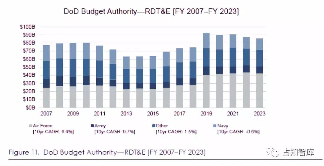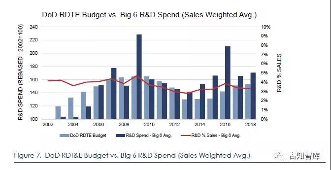 从全球来看,A&D公司是研发支出最低的公司之一。就绝对数字而言,全球A&D工业在研发方面的支出远低于其他关键部门。就创新强度(用于R&D的销售额百分比)而言,支出也相对较低,为4.1%,落后于其他部门。尽管国防部预算和公司支出的规模和时间点(财政年度与日历年度)不同,但趋势图显示,“六大”国防承包商在R&D的支出,与国防部的研究、开发、测试和评估(RDT&E)支出趋势一致。这意味着国防供应商依赖国防部在新技术和能力研发方面的投入。