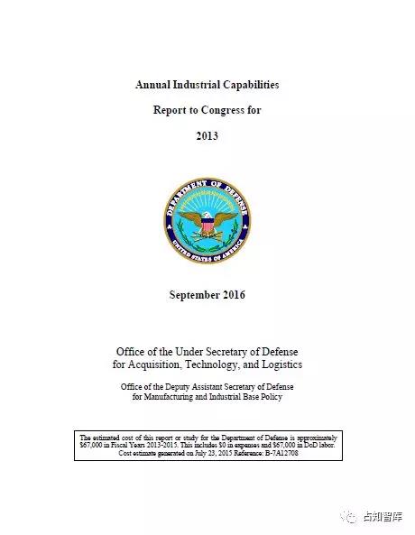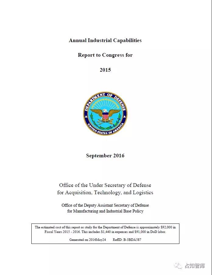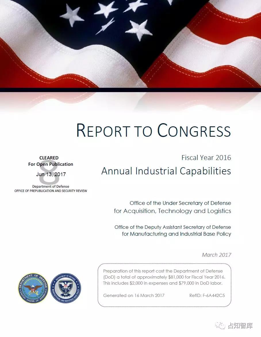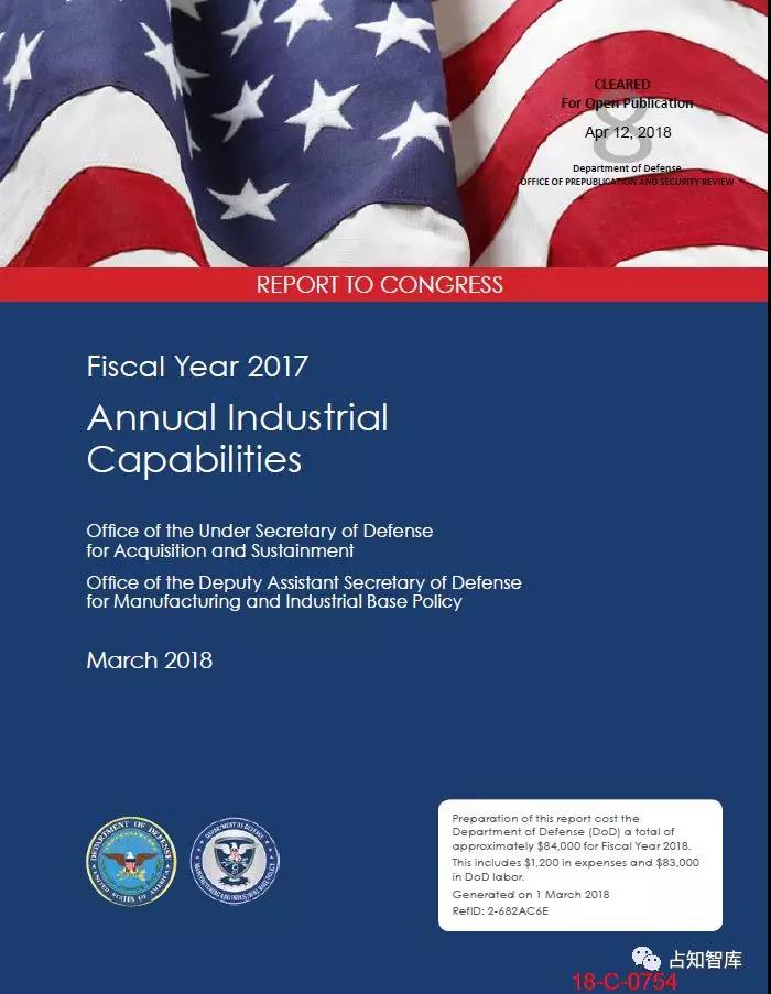 美国非常重视关键基础设施防护,特别是国防工业基础。每年都对国防工业能力进行评估,进行全面“体检”,发布年度报告,以保证其持续健康发展。前期,占知提供了美国国防部于2018年9月向特没谱提交的《美国制造业和国防工业基础平台》报告。