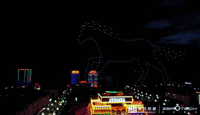 200架无人机通过动态飞行和灯光变化,呈现出多种不同造型,展示民族文化和旅游特色,点亮了热贡的茫茫夜空,为群众和游客带来了新奇的视觉盛宴。