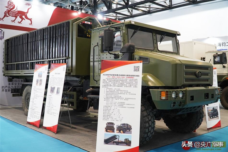 现场展出的钩臂式设障车,该车展开后能形成一个宽度50米、高度2.2米的阻截网墙。