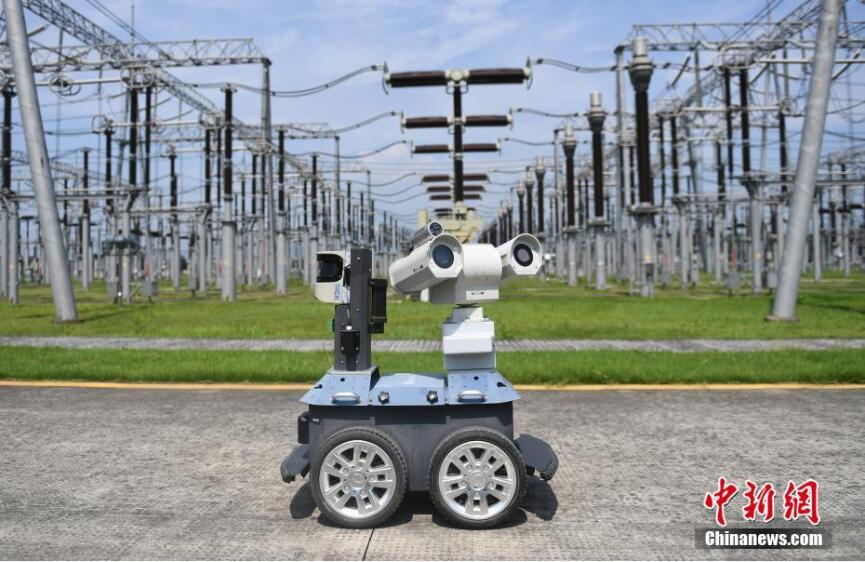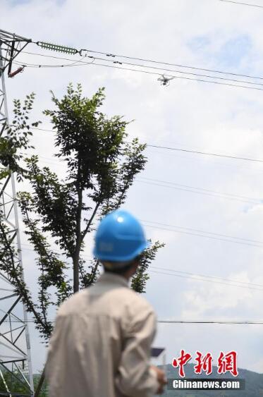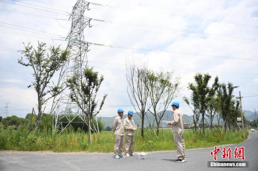 7月26日,两位工作人员在使用无人机巡检电力设施。当日,浙江省电力部门工作人员高温之下利用机器人、无人机等巡检电力设施,保障夏季电力供应。