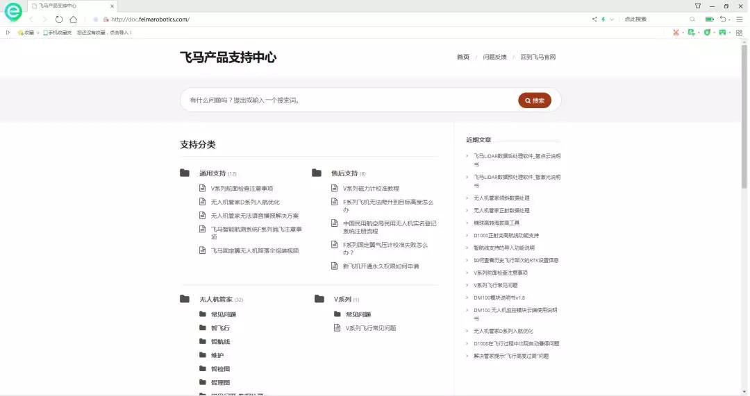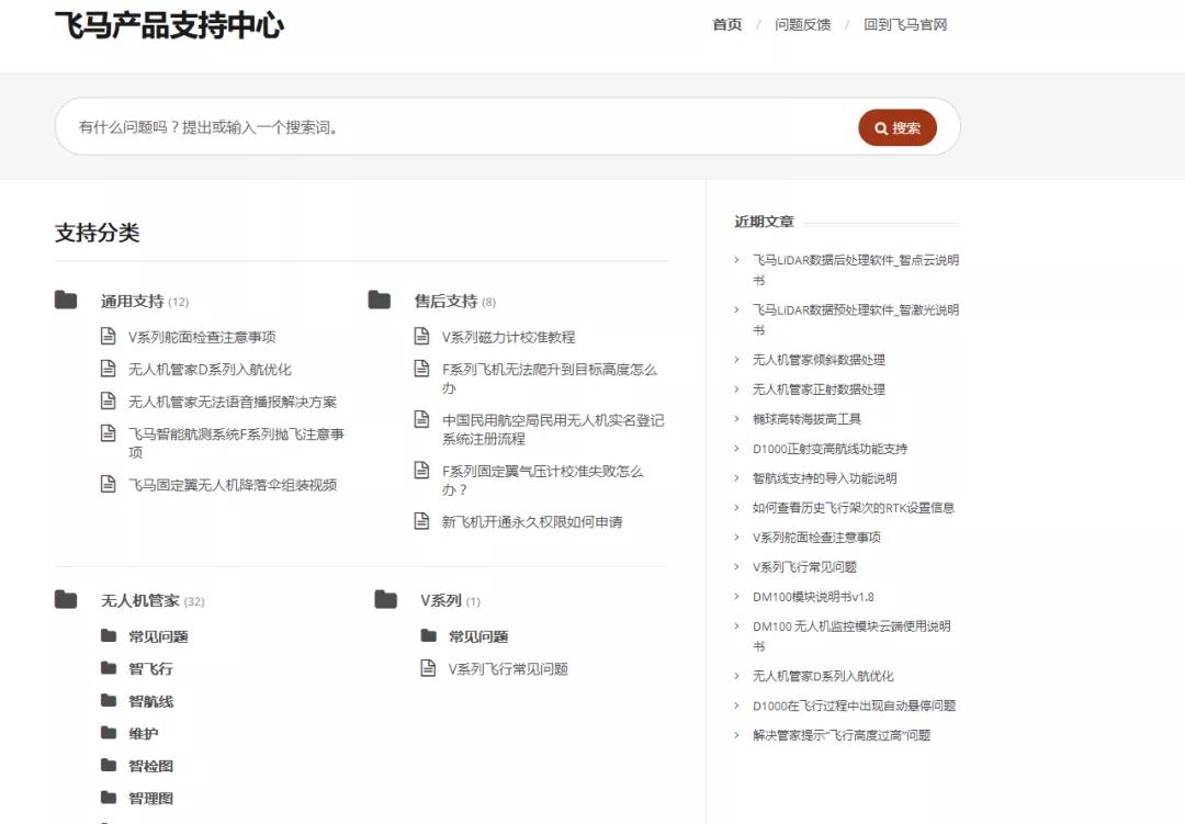 为了更好的服务广大用户,飞马无人机管家还推出了云端“飞马技术支持中心”,其收录了从飞机硬件到数据处理软件等各模块的使用说明、作业流程及常见问题的解决方法。用户输入关键字,即可查询答案,解决日常碰到的技术问题,用户也可反馈自己遇到的问题,我们将更新其解决方案到云端,相互形成良好的反馈与支持的运行机制,为飞马用户提供更好的使用体验。