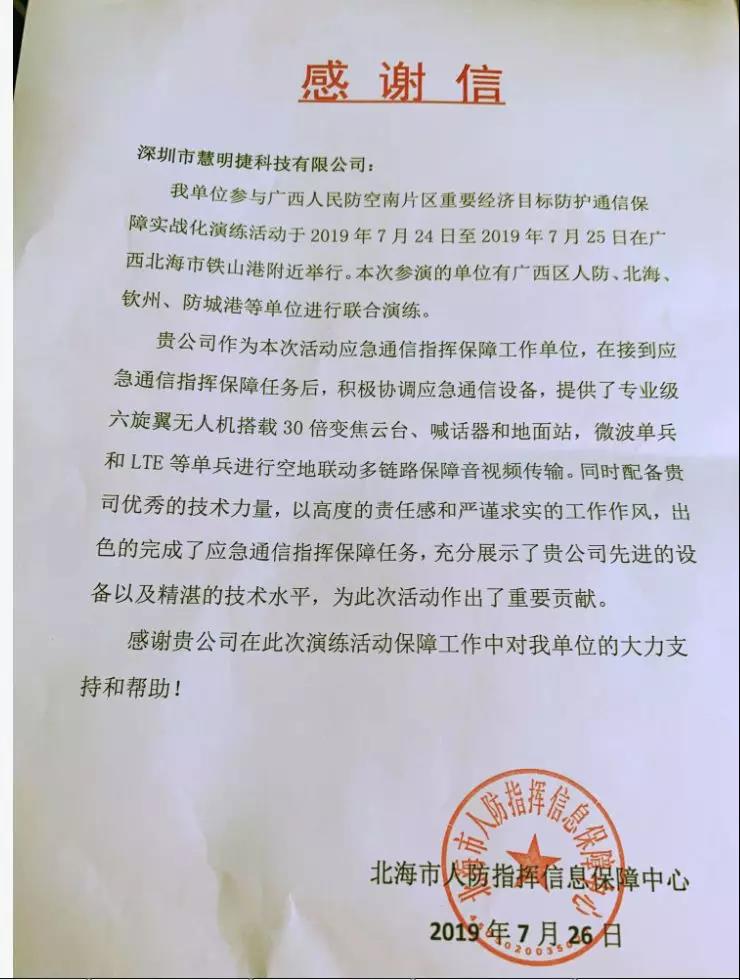 北海市人防海防办主任谢文表示,这次演练以重要经济目标防护为主题开展实兵实训,参演单位和人员围绕确保战时状态下各级指挥机构通信顺畅的目标,设置演练科目和特定情况,训练我们参演单位和人员的战时反应能力、特殊情况的研判处置能力、通信手段和设备的操控能力,训练我们的组织指挥能力、执行能力、协同配合能力、抗干扰能力等。要通过经常性演练训练,提高我们业务能力和军事素质。慧明捷在本次演练中的出色表现得到了领导的一致赞誉,获得了北海市人防指挥信息保障中心开出的感谢信。