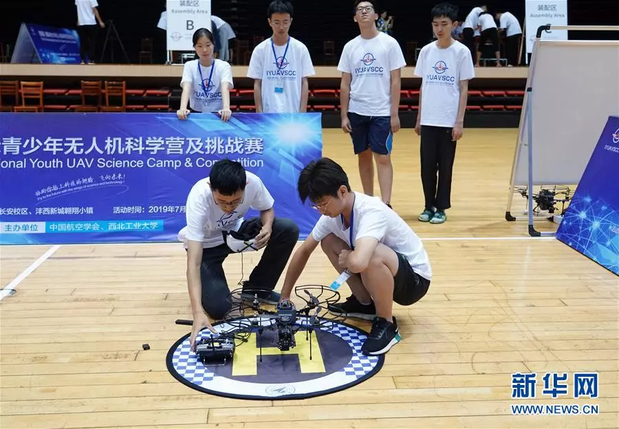 7月21日,参赛选手在比赛中降落无人机。当日,由中国航空学会、西北工业大学主办的首届国际青少年无人机科学营及挑战赛在西安开赛,吸引了来自国内十几个省份的百名高中生,以及俄罗斯、匈牙利、马来西亚、泰国等国家的学生参与。