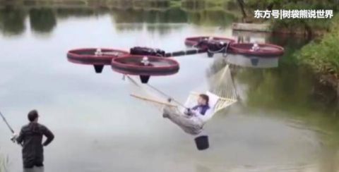 众所周知,随着科技的发展,无人机的用途越来越广,然而,在国外有一个叫做 Pim Bucker 的小哥,他通过多次试验,自己做了一台体积巨大、外形酷炫的无人机。并且这个无人机就只有一个功能。前前后后他设计了多张草稿,最终成功研制出来。那么 这台无人机唯一的功能是什么呢?没错,正如大家所看到的这样,这台挂着吊床的无人机唯一的功能,就是让 Pim Bucker 可以躺在上面,跟着无人机飞来飞去。听起来十分的科幻。
