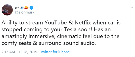 (IT之家)新浪美股讯 继可以在特斯拉上打游戏之后,特斯拉首席执行官埃隆-马斯克(Elon Musk)在推特上宣布,特斯拉即将实现在汽车停止移动后,播放YouTube和Netflix的流媒体功能。