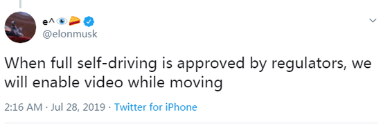 马斯克在回应一位推特用户时表示,这一变化可能会在8月份到来,不会“超过几个月”。马斯克在另一条推特中表示,一旦监管机构批准了全自动驾驶汽车,特斯拉车主将能够在汽车行驶过程中观看视频。