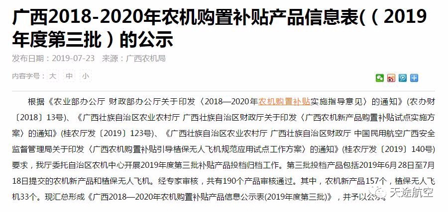 日前,广西省下发了关于2018-2020年农机购置补贴产品信息表((2019年度第三批)的公示,天途三款机型入围广西省农机补贴,入围机型及补贴金额分别为:
