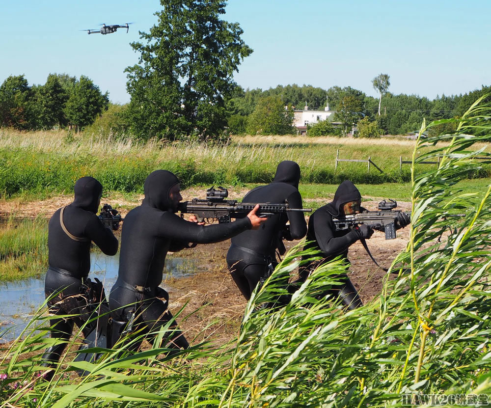 在大疆无人机的伴随下,蛙人部队开始登陆。