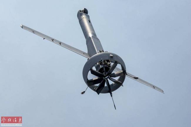V-BAT无人机垂直起飞瞬间,可见尾部的涵道式风扇特写,其在起降阶段提供垂直升力,在转入水平飞行后,直接提供主动力飞行。