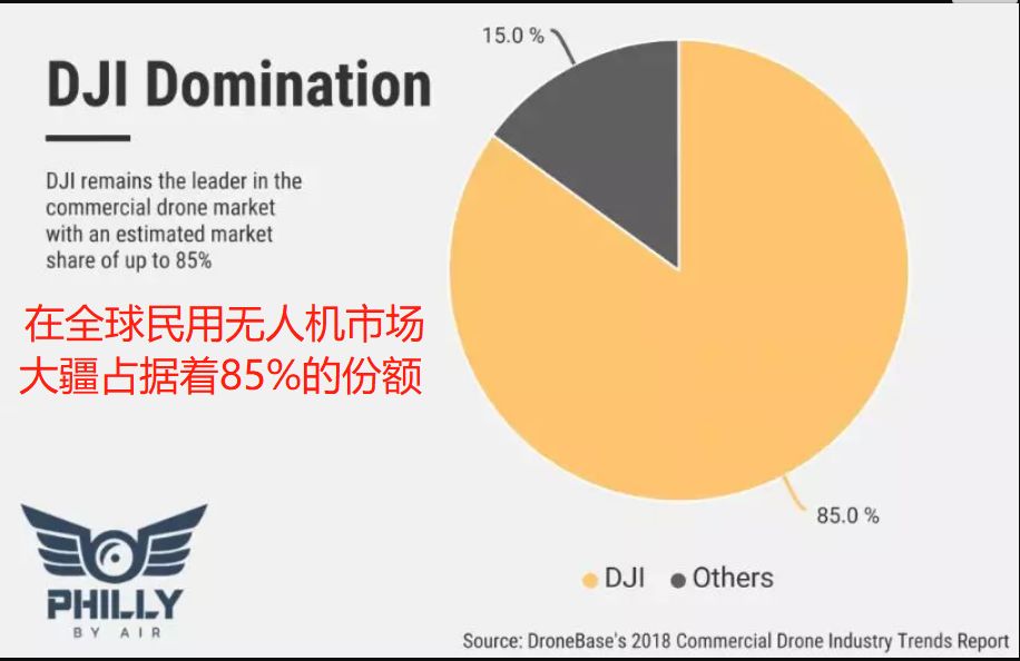 仅仅五年的时间,大疆凭借着技术上的碾压,实现了市场上的垄断,从去年的市场占有率看,在全球民用无人机市场大疆占了85%的份额,其他品牌通通被归到了“其他”。