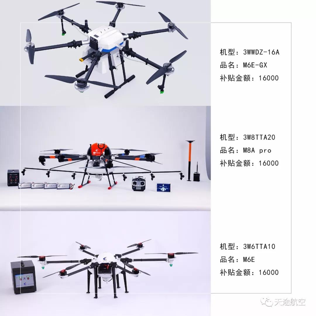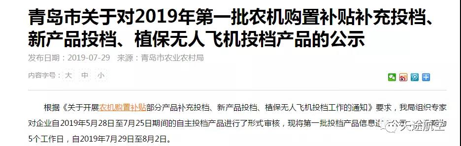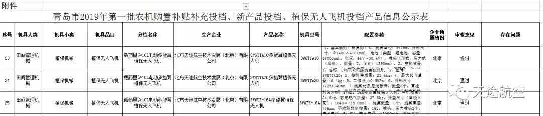 7月29日,青岛市下发了关于对2019年第一批农机购置补贴补充投档、新产品投档、植保无人飞机投档产品的公示,天途三款机型入围青岛市农机补贴,入围机型及补贴金额分别为: