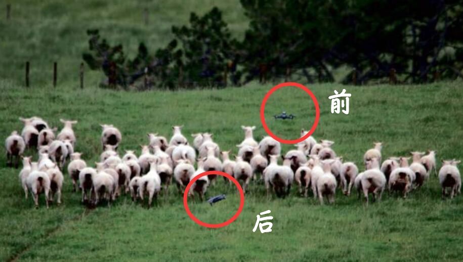 无人机绑上一个喇叭,采用前后夹击的排兵布阵,很快就把羊都赶了回来