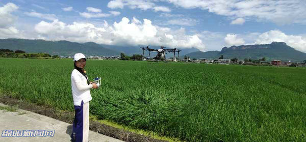 “左转、直飞、停留、右转、降落……”7月30日上午,雨后的江油武都镇涪阳村阳光灿烂,一望无际的稻田泛着绿浪,明利家庭农场的女主人郑明利正手持摇杆,控制着无人机进行植保作业,给出穗扬花的稻子喷洒农药。