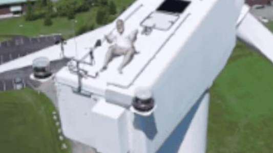 无人机在高空拍下来碧海蓝天的美景还有近观风力发电机的震撼画面,Kevin操控无人机更接近风力发电机想看的更清楚。没想到却看到让他腿肚子发软的一幕:在风力发电机倾斜的顶部,一名男子似乎正躺在上面晒太阳!
