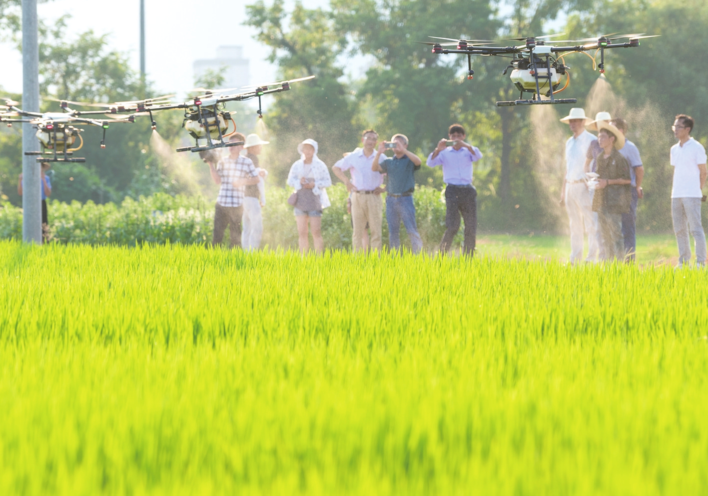 7月29日下午,在安徽省潜山市梅城镇彭岭村水稻田里,三架喷药无人机在技术员的操作下,开始低空飞行,并向稻田均匀地喷洒农药。采用无人机进行病虫害统防统治。