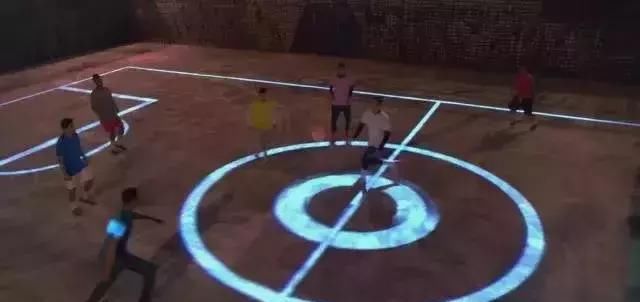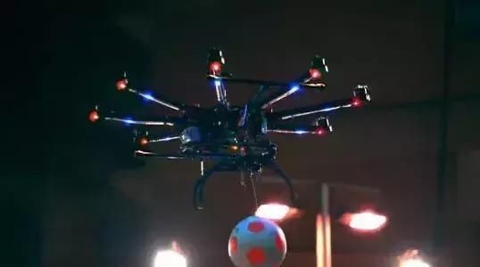 灯光打造的球场上,无人飞行器扮演成裁判,开场时叼着一只荧光足球飞来,当有人犯规时还判罚了一张黄牌。