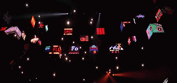 金属乐队Metallica为期14周的北美体育场表演上,100台无人机从舞台内置的道具升降机中升起,在乐队的上空形成了多个编队,与52个可升降的LED视频立方吊顶共同部署舞台效果。