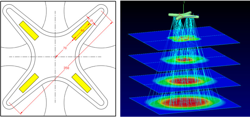 该款无人机轴距为350mm,4个UVC-LED光源模组的尺寸及安装位置如下图黄色位置。按照4%的光电转化效率计算,每个光源模组光功率为1000mw,出光角30度,空气的透光率按照80%/m计算。光学模拟显示在1米的距离处(最下方接收面)的光照面积为0.65平米,平均光强为0.5mw/cm2。