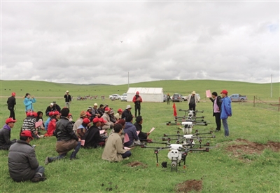 近年来,我省采用无人机和大型器械,生物防控草原虫害,取得了一定的效果,并在全省草原虫害防控工作中大面积推广使用。生物防控草原虫害标准化试点项目,建立生物防控草原虫害的标准化体系,将有效地控制以三江源区为代表的泽库县草原害虫的危害,减少草原虫害的损失,提高天然草地植被盖度和产草量。 自2017年该项目启动以来,先后邀请有关专家,针对试点区农牧民缺乏生物防控草原虫害标准化技术的现状,对 150 名当地牧民进行了实地和理论教学两期培训班,培训 300 人(次),发放了由技术小组编印的《生物防控草原虫害农牧民技术手册》培训教材 100 册,做到了人手一册,使试点区牧户了解建立生物防控草原虫害试点区的重大意义和作用,提高牧民对生物防控草原虫害标准体系建设的理解和认知度,为进一步加快标准化示范区建设起到了带动作用。 (图为无人机和大型器械生物防控草原虫害。)