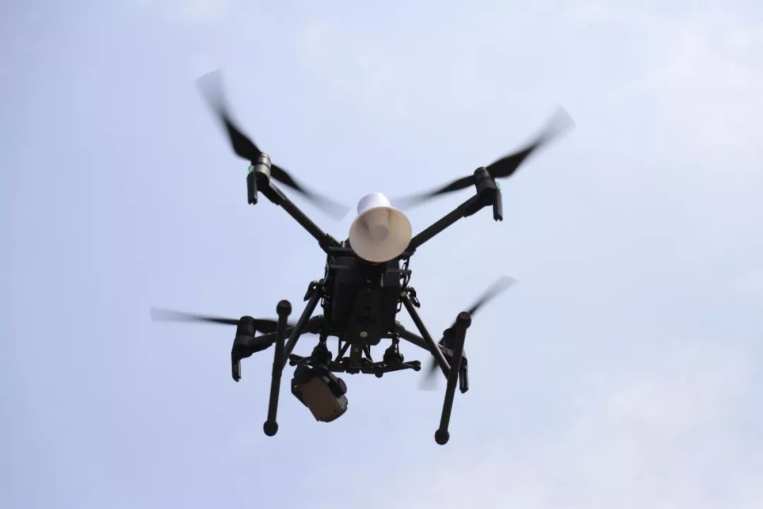 无人机上安装了喇叭,民警利用喊话器隔空喊话,将违法行为人引导至合适地点进行处罚教育。