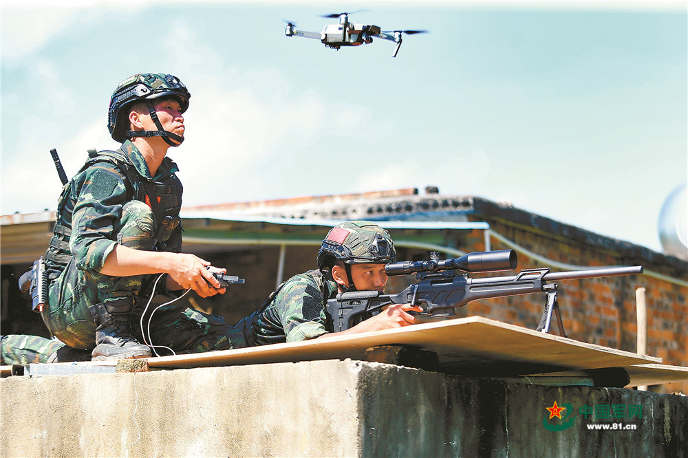 狙击课目中,特战队员利用无人机标定目标方位