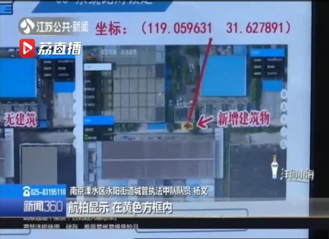 南京溧水区永阳街道城管执法中队队员杨文表示,今年4月份航拍时,图片上黄色方框内是没有出现任何建筑物。而在6月份的拍摄中,航拍显示在黄色方框内出现了一处蓝底彩钢瓦建筑物。
