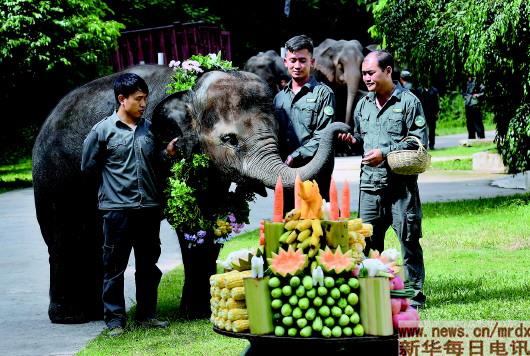 8月12日,西双版纳傣族自治州野象谷景区的“象爸爸”为救助象“羊妞”庆祝4周岁生日。均为新华社记者杨宗友摄