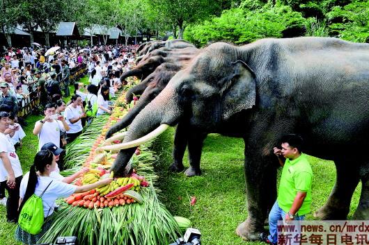 8月12日是世界大象日。在云南省西双版纳傣族自治州野象谷景区,一群头戴花环的亚洲象尽情享用胡萝卜、菠萝、西瓜等新鲜水果大餐。来自各地的游客纷纷与这些憨态可掬的大块头合影。
