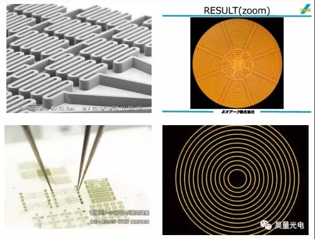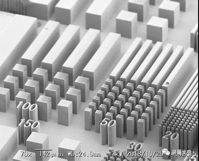 该设备采用365nm的紫外LED作为光源,可以适用于SU-8、AZ-P1350等众多的光刻胶,并且LED相对于汞灯和激光拥有更好的光源稳定性和均匀性,使用寿命可达10000小时。采用DMD作为数字掩膜,增加了设备的灵活性,可以根据自己的需求灵活设计和改变掩膜图形,采用10倍物镜时,光刻线宽可达到3微米,单次曝光面积可达到1X0.6mm,并在1s内完成曝光。若采用2倍物镜单次曝光面积可达5X3mm,并可以获得较高的深宽比,使用SU-8光刻胶时可获得深度超过100μm的陡直结构。