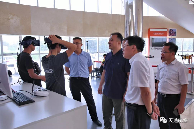 天途航空总经理杜立新出席并接待,介绍了天途航空的发展历程、产品规划及市场布局。随后,考察了天途无人机生产及培训基地,对天途自主研发的VR无人机虚拟仿真系统给予了高度肯定。