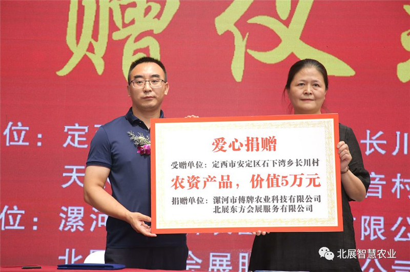 论坛同期还举办了公益扶贫项目捐赠活动。漯河市傅牌农业科技有限公司出资10万元对定西市安定区石下湾乡长川村、天水市清水县山门镇观音村农资设施进行捐赠。漯河市傅牌农业科技有限公司董事长傅世平、甘肃省广播电视大学扶贫办公室主任李军、甘肃省自然能源研究所帮扶主任(驻定西市安定区石下湾乡长川村第一书记)冯小云先生上台进行捐赠仪式。
