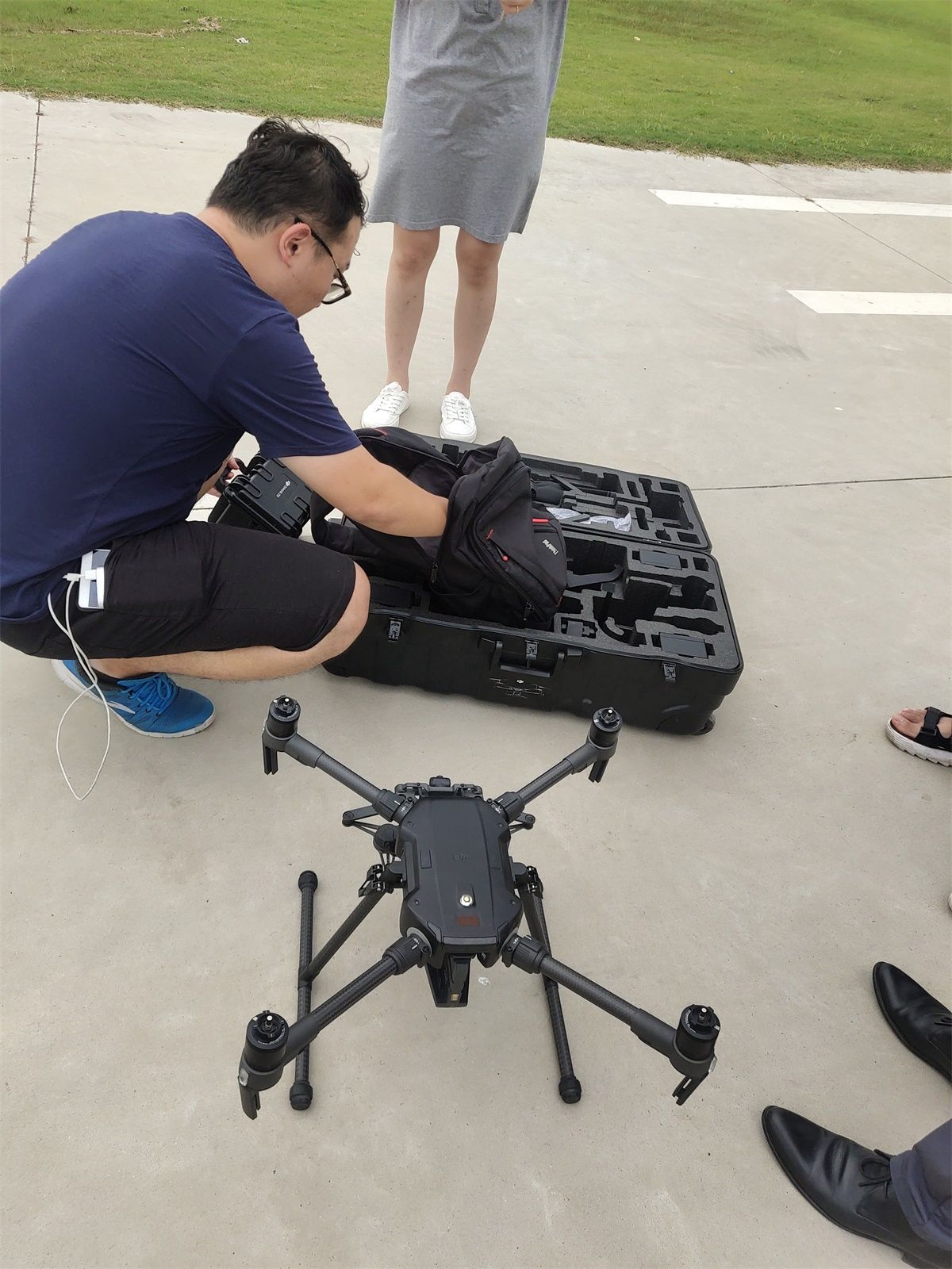 在现场的交流中,我们了解到幻飞智控在环境保护领域中不断突破自我的状态,今天夏总带来的是大疆无人机大气监测与采集的整体解决方案。午后,我们便一同驱车前往上海月湖雕塑公园,在无人机网华东测飞基地的飞场上,夏总他们打开了产品,其中大疆M210无人机一台、幻飞智控自主研发的HF-G6-DJI一个、一次性空气采集袋一个、DJI X30云台相机一个、遥控器一个、幻飞智控云平台软件。首先展开的是大疆M210无人机平台,然后一个端口装配着云台相机,一个端口装配幻飞智控的大气监测产品HF-G6-DJI,因为这是幻飞智控根据大疆开放的端口制作的产品,所以在装配的时候很快捷,就跟大疆的云台装配一样简单。