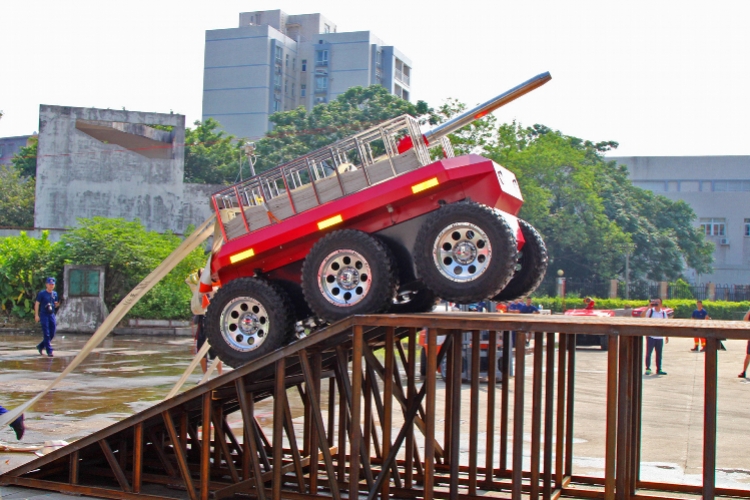 灭火机器人灭火操作比赛现场,机器人正在翻越障碍