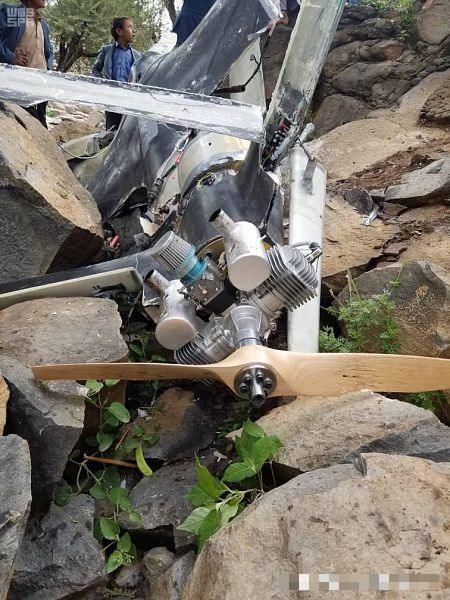 8月13日,也门联军发言人图尔基·马利基上校在当天的新闻发布会上证实,胡赛武装于当天上午发射的一架自杀无人机坠落在了北部的阿姆兰省境内,联军已经获得了该机的残骸。根据马利基上校在发布会上放出的图片可以识别出,这是一架胡赛在7月份刚刚公开的samad-1型无人机。由于坠落地点是山区的乱石堆,所以整机摔的比较散,但是机体后部保存的还比较完整,尤其是发动机部分并未受到严重创伤。虽然这款无人机实际上是伊朗转让的技术,但是从裸露出的发动机外形和上面的标志可以看出,它使用的居然是一家我国云南民企生产的小型民用发动机。